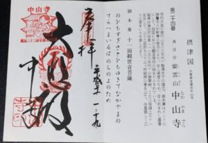西国三十三ヵ所めぐり 第二十四番「中山寺」 御朱印 X Facebook はてブ Pocket LINE コピー 2025.06.06 順番が前後してしまいましたが、平成31年1月19日に伺ったのが 「中山寺」こちらは西国三十三ヵ所めぐりの24番としてだけでなく 安産祈願のお寺として有名なお寺でもあります。 先ほどの清澄寺からも近い場所の宝塚にあります。 御朱印の中の印にも、安産のものが押されています。